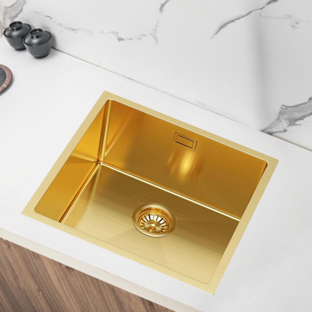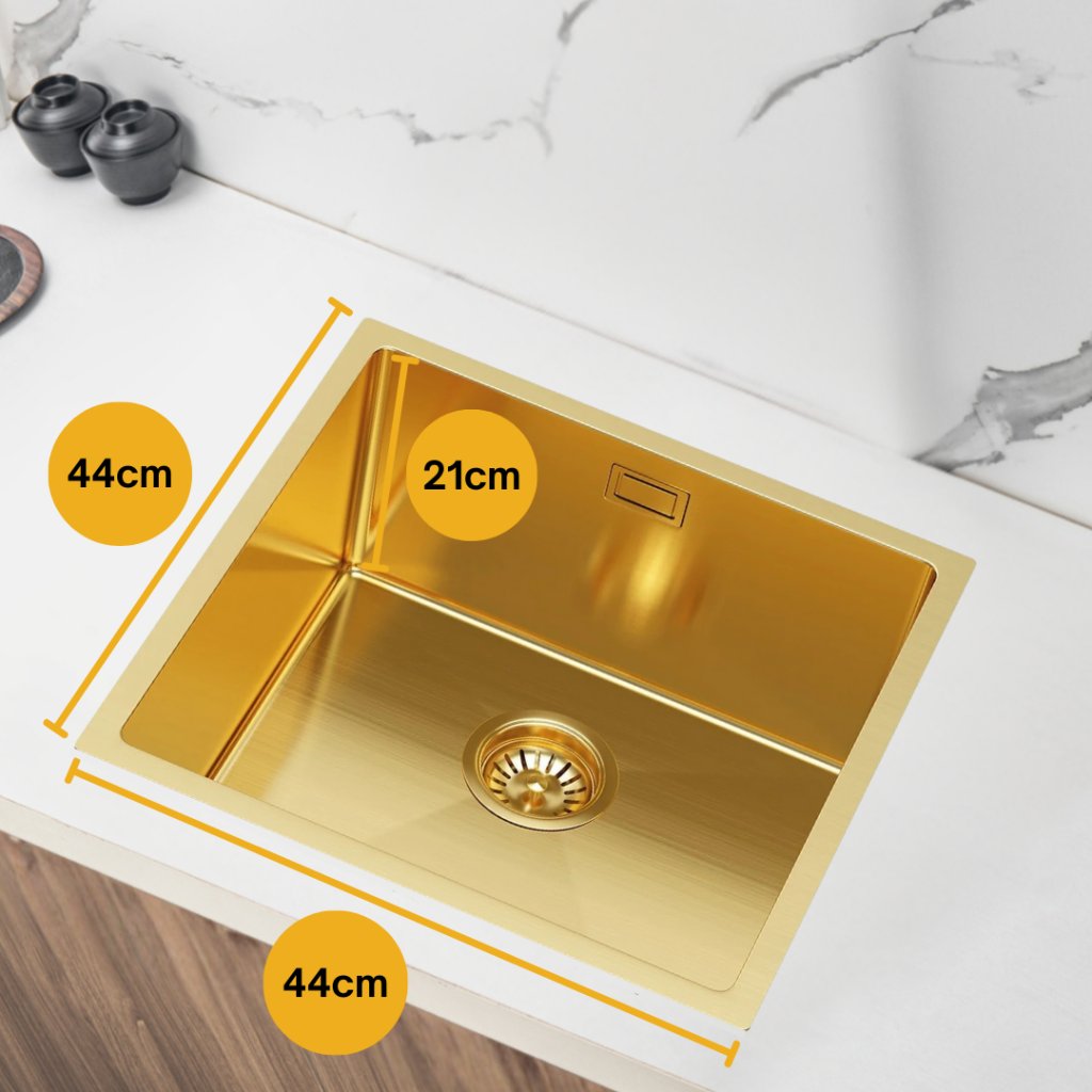 Dřez je v nabídce ve třech elegantních barevných variantách – nerez, zlato a grafit. Díky tomu si snadno vyberete provedení, které nejlépe ladí s vaší kuchyní, armaturami nebo spotřebiči. Každý odstín dodá kuchyňské lince jiný charakter – nerez pro klasický vzhled, zlato pro luxusní nádech a grafit pro moderní, industriální styl.
