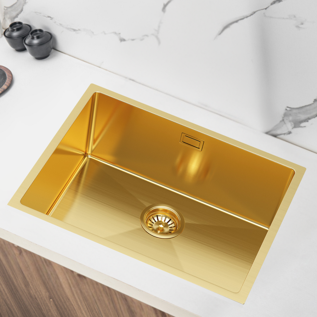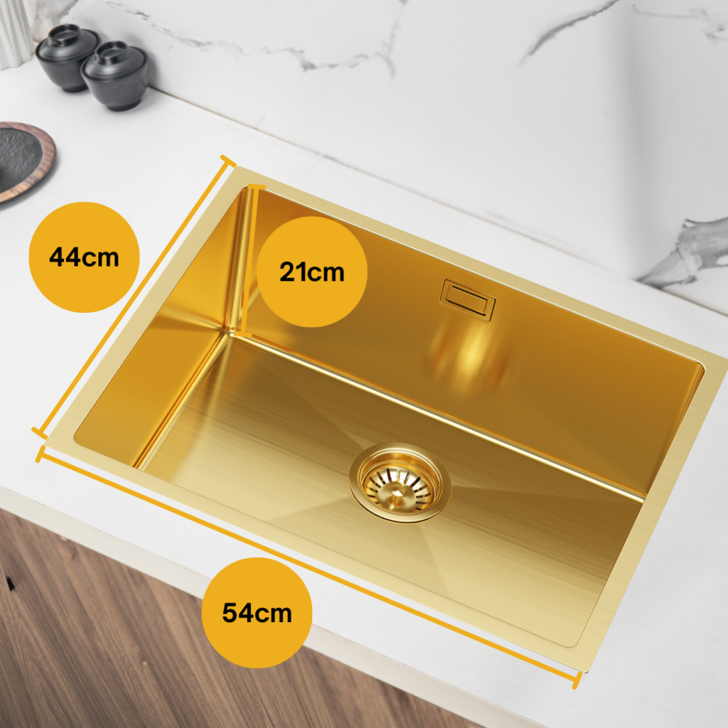 Dřez je v nabídce ve třech elegantních barevných variantách – nerez, zlato a grafit. Díky tomu si snadno vyberete provedení, které nejlépe ladí s vaší kuchyní, armaturami nebo spotřebiči. Každý odstín dodá kuchyňské lince jiný charakter – nerez pro klasický vzhled, zlato pro luxusní nádech a grafit pro moderní, industriální styl.