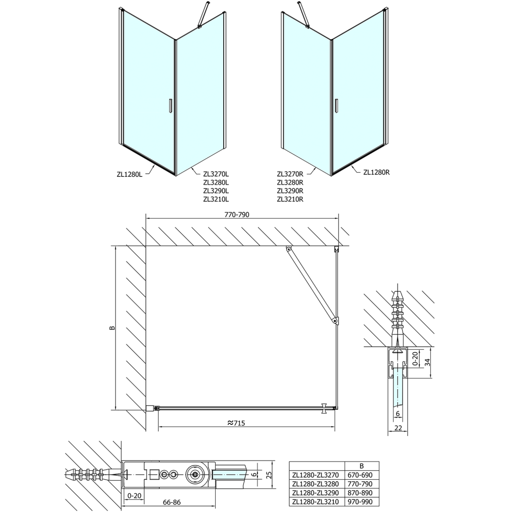 - Skládací dveře 700 až 900 mm v provedení levá a pravá lze instalovat do niky nebo v kombinaci L/R vytvořit čtvercovou nebo obdélníkovou zástěnu s rohovým vstupem