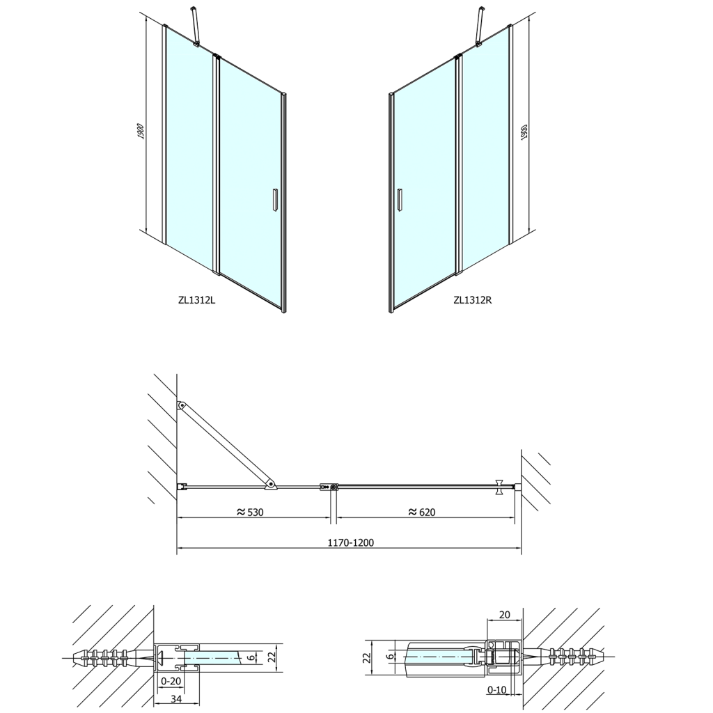 - Dveře 1600 a 1800 mm mají 2 pevné části a 2 otočné části, vhodné pouze pro instalaci do niky, nelze je kombinovat s boční stěnou