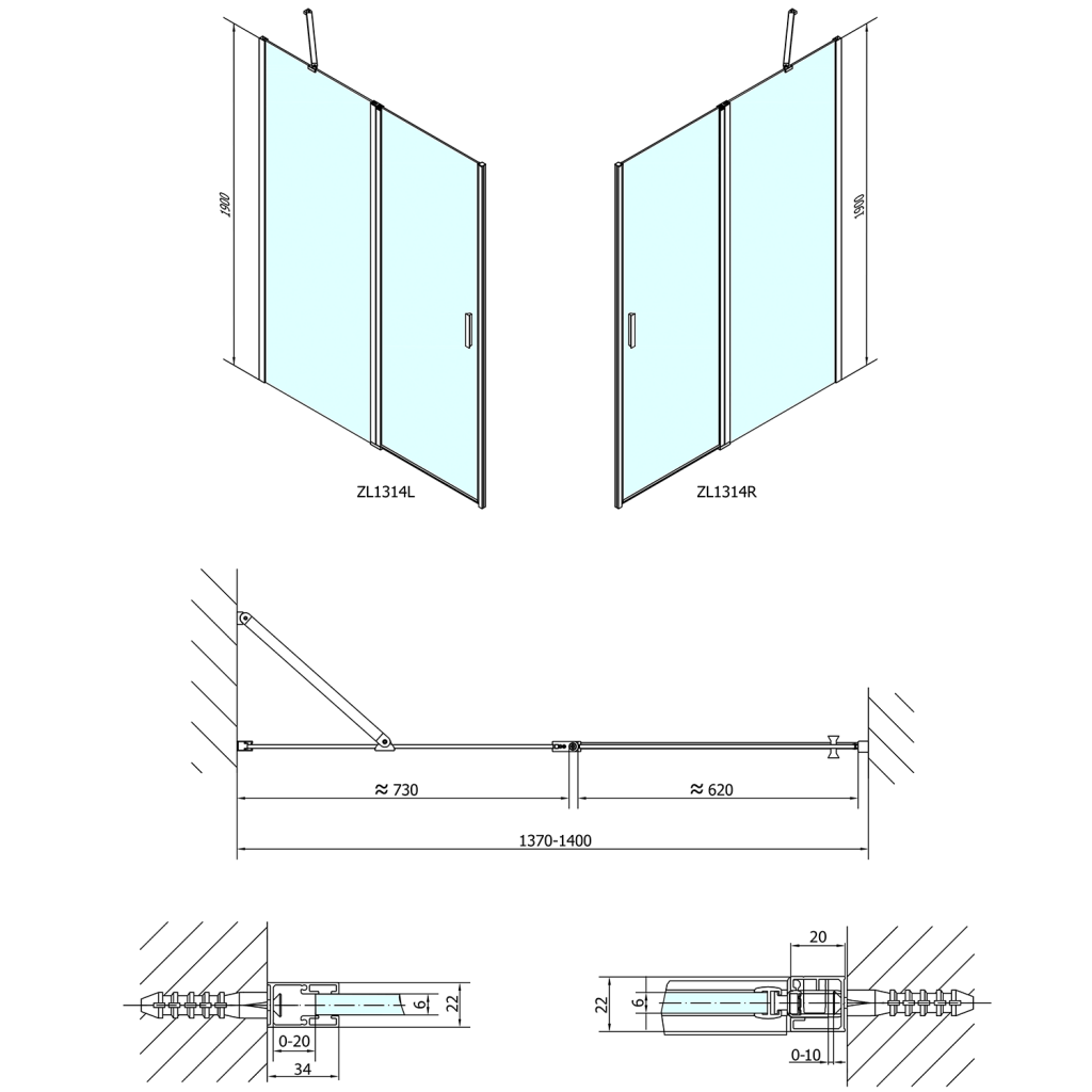 - Dveře 1600 a 1800 mm mají 2 pevné části a 2 otočné části, vhodné pouze pro instalaci do niky, nelze je kombinovat s boční stěnou