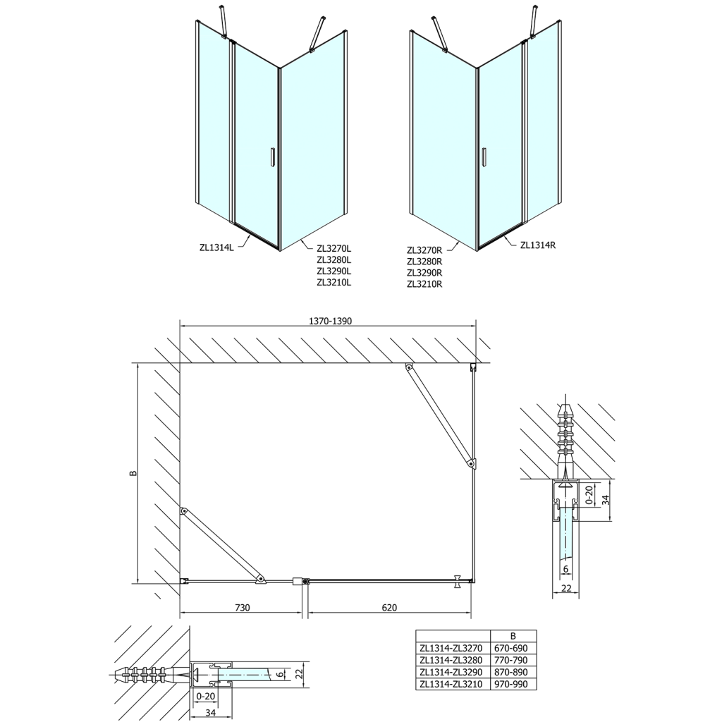 - Skládací dveře 700 až 900 mm v provedení levá a pravá lze instalovat do niky nebo v kombinaci L/R vytvořit čtvercovou nebo obdélníkovou zástěnu s rohovým vstupem