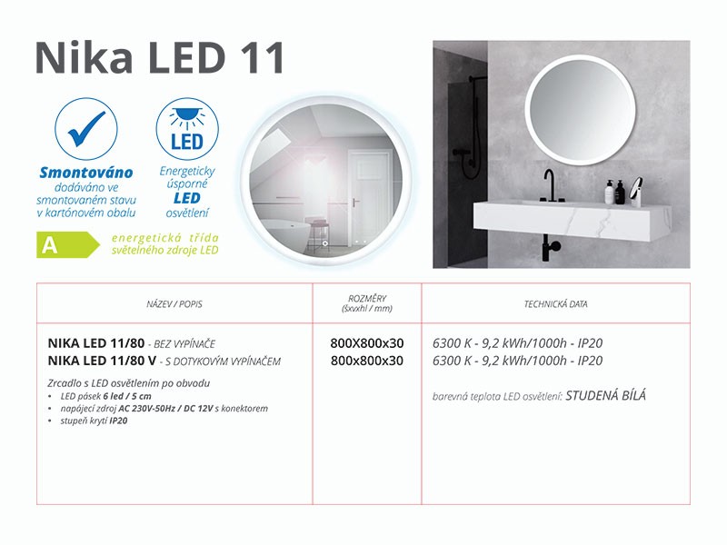 | Popis: | zrcadlo závěsné s LED osvětlením po obvodu • LED osvětlení • napájecí zdroj s konektorem • dotykový vypínač |