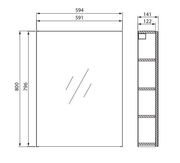 Závěsná skříňka se zrcadlovým čelem a 3 policemi uvnitř, která poslouží jako zrcadlo i jako místo pro uložení drobné kosmetiky. Zrcadlová skříňka má bezúchytkový systém otevírání dvířek a tiché "soft close". Korpus skříně je vyroben z laminované dřevotřískocé desky.