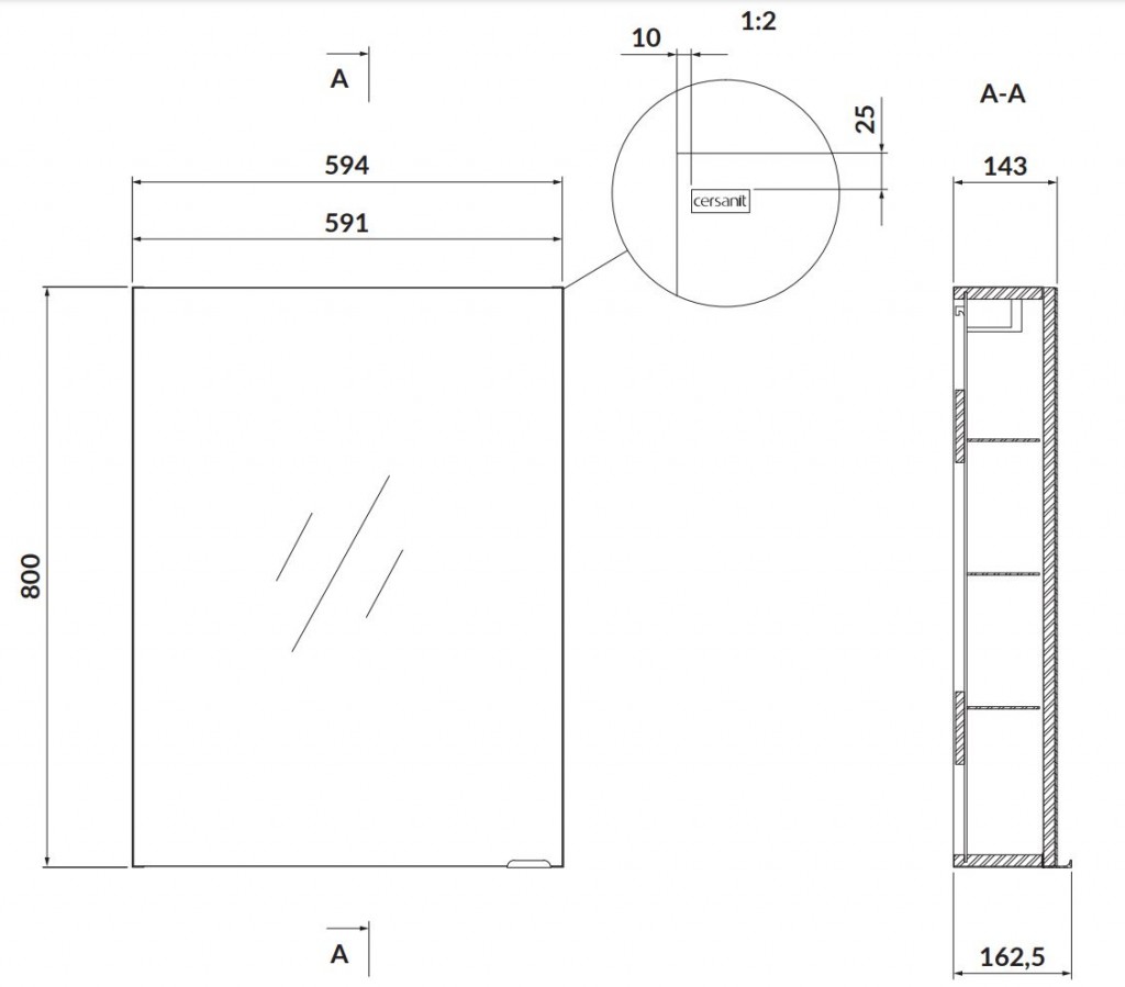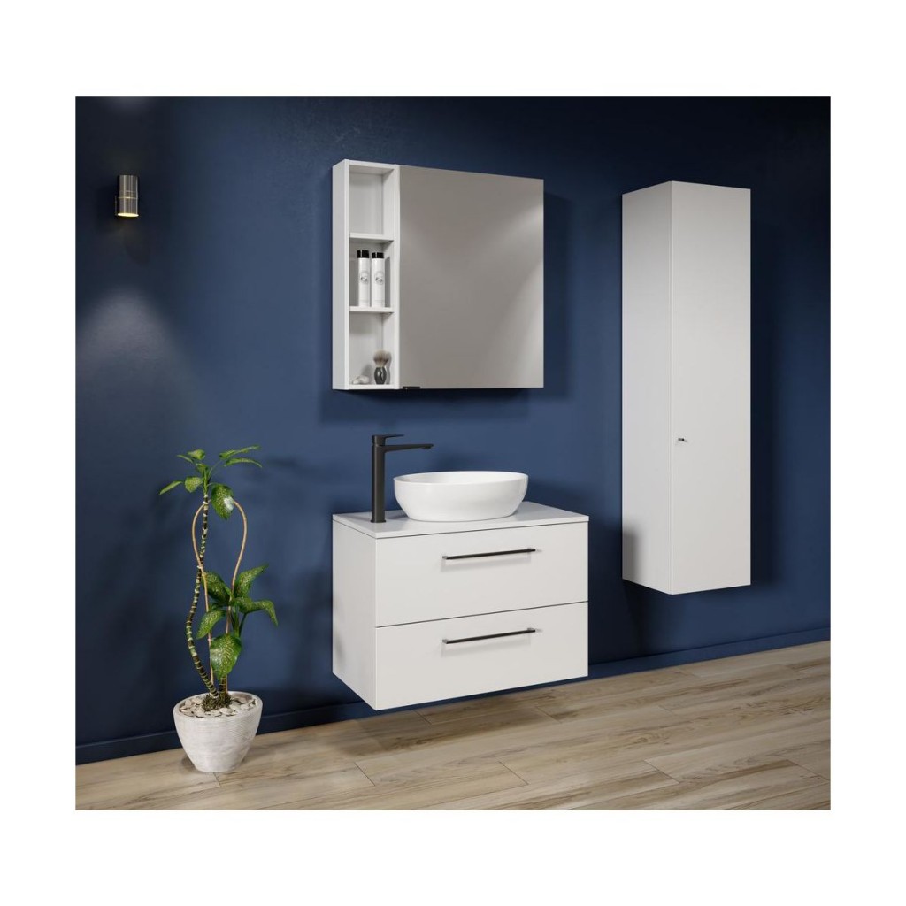 Horní zrcadlová skříňka z laminované dřevotřískové desky a se stříbrnou úchytkou. Uvnitř jsou 3 skleněné police a panty jsou s měkkým dovíráním. Dřevotřísková deska použitá ve skříni má certifikát FSC MIX CREDIT SGSCH-COC-007574.